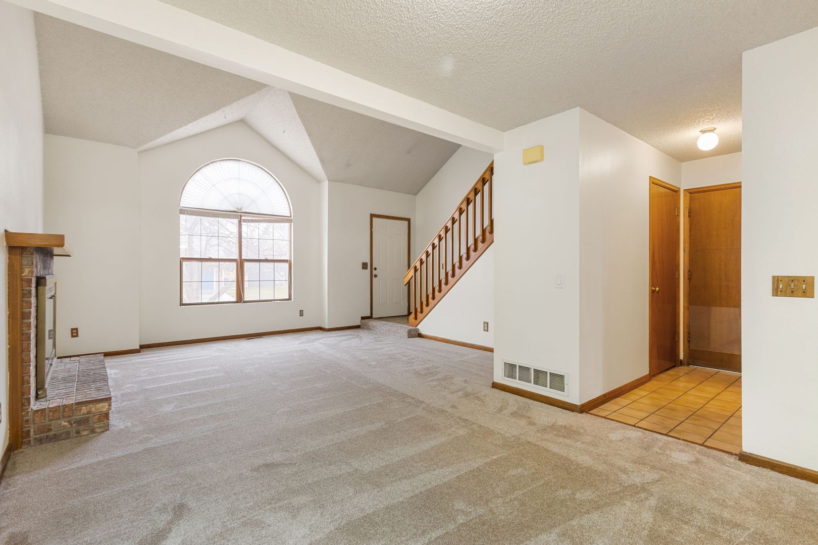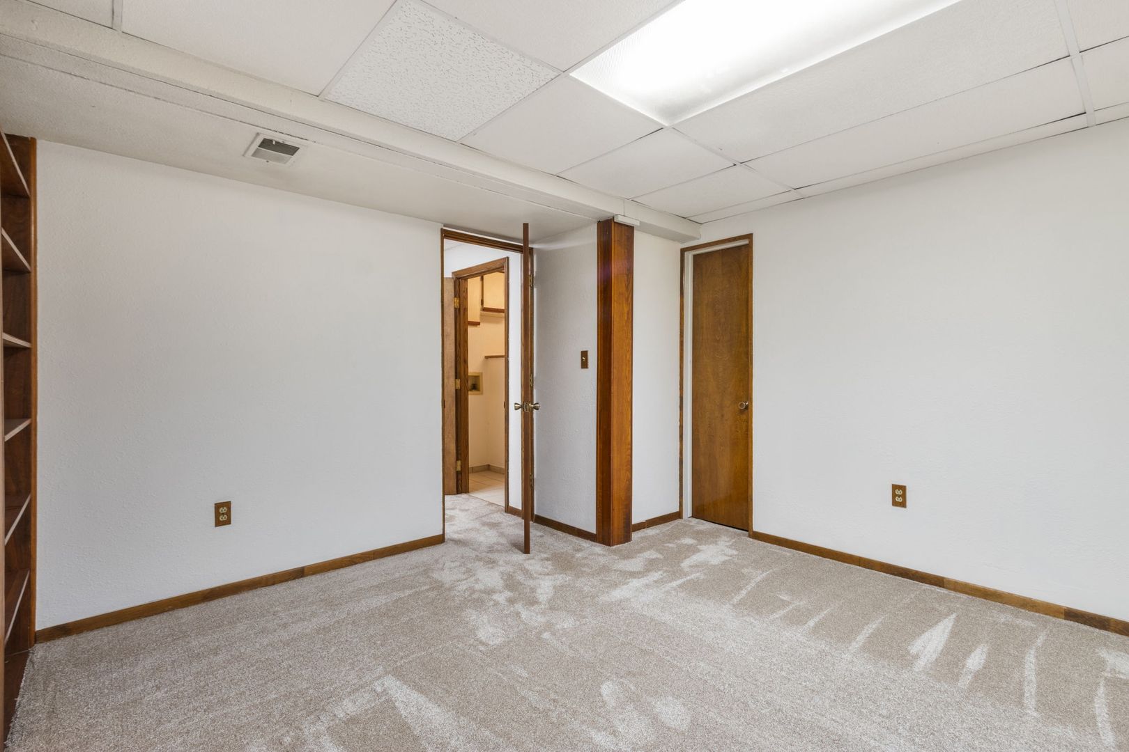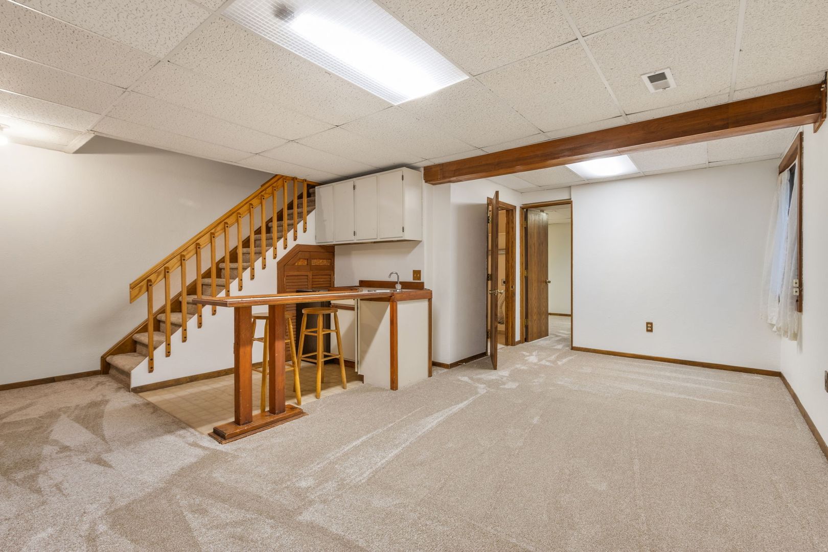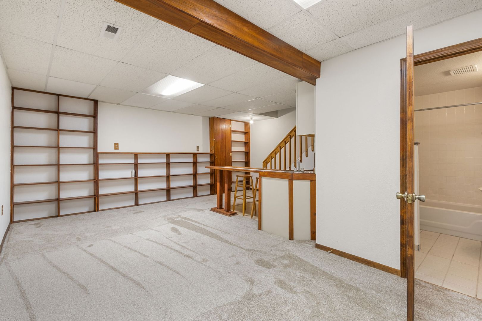 Interior has gas fireplace, whole house fan, A/C, vaulted ceilings, finished basement with great shelving on one wall.