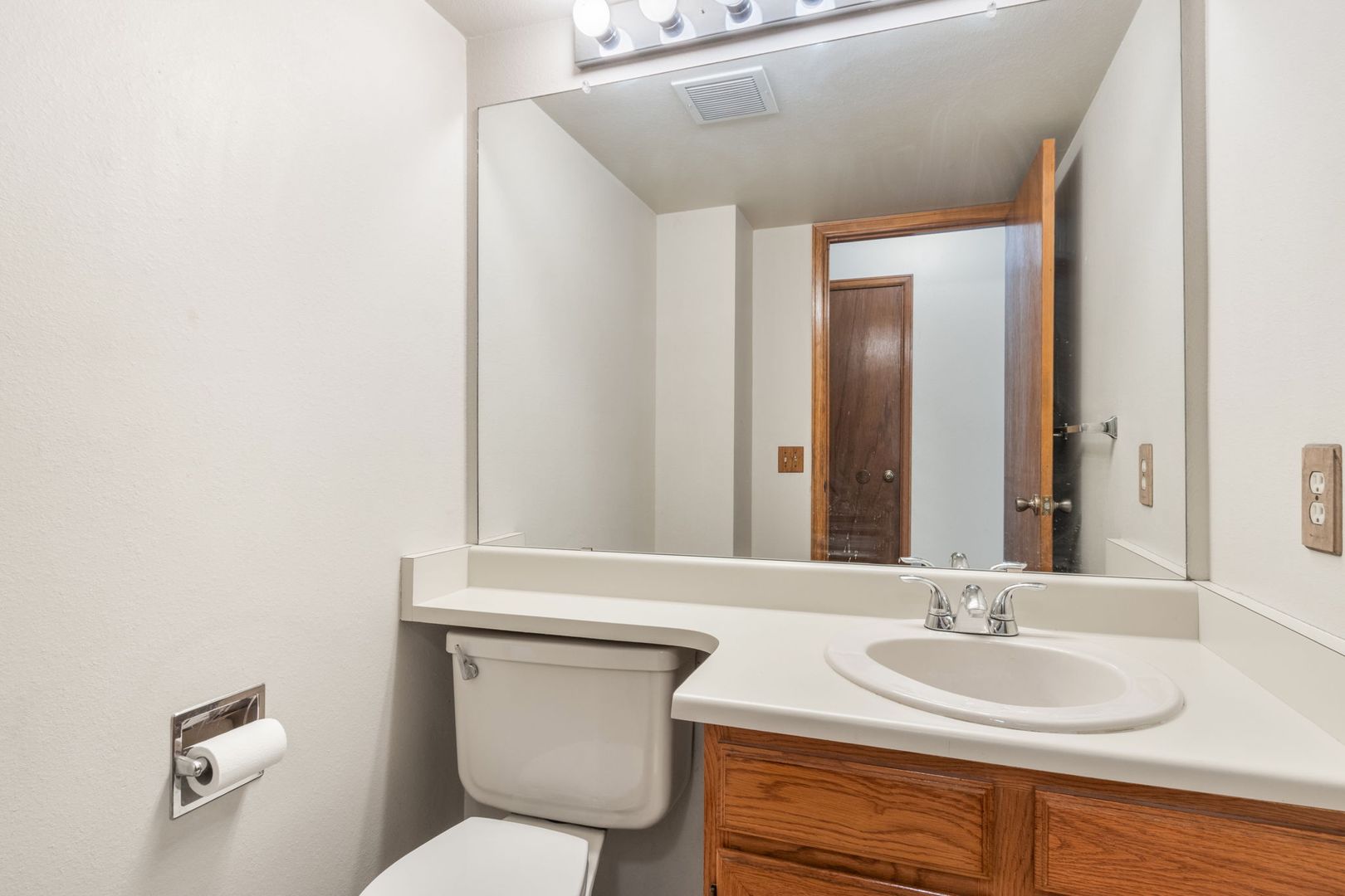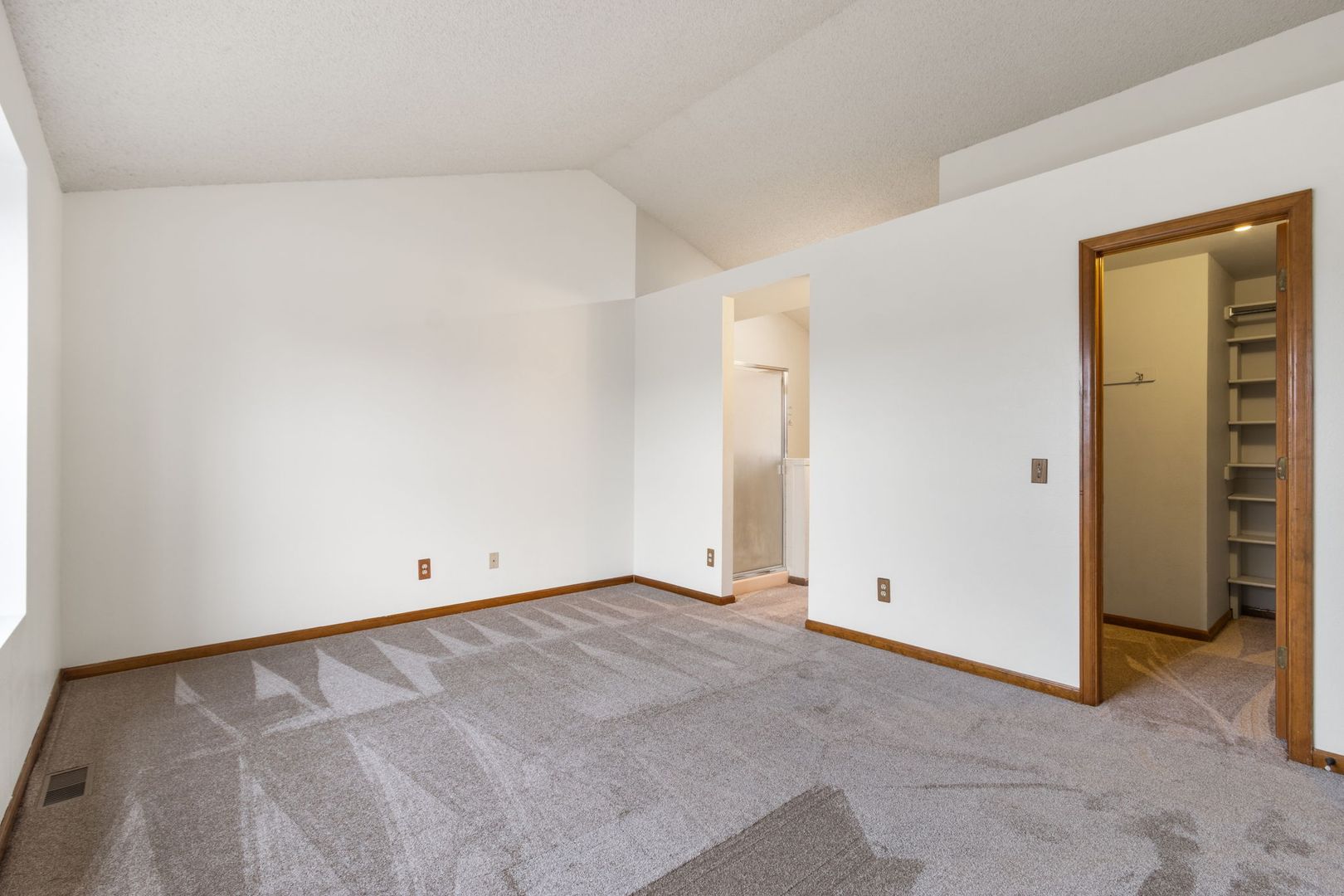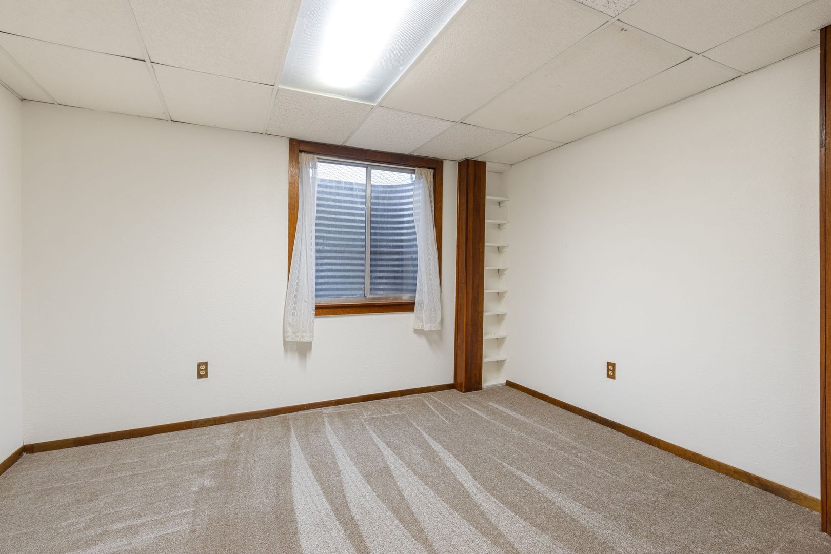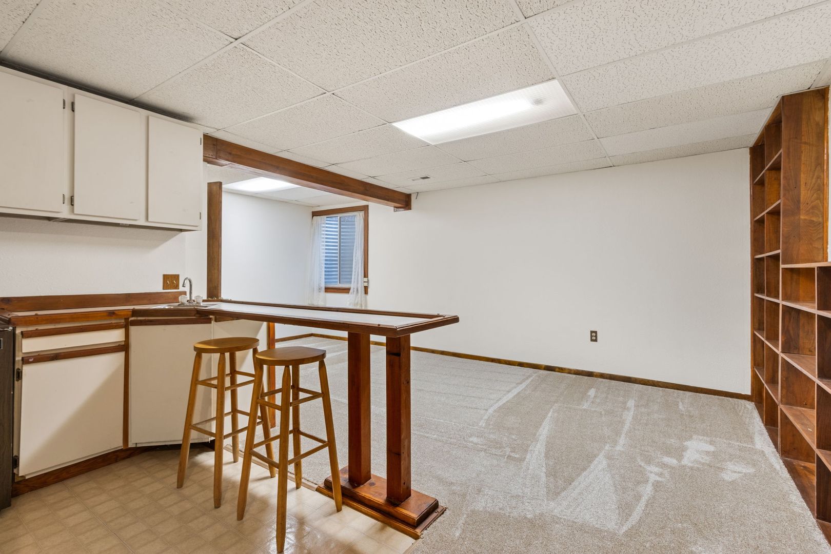 Interior has gas fireplace, whole house fan, A/C, vaulted ceilings, finished basement with great shelving on one wall.