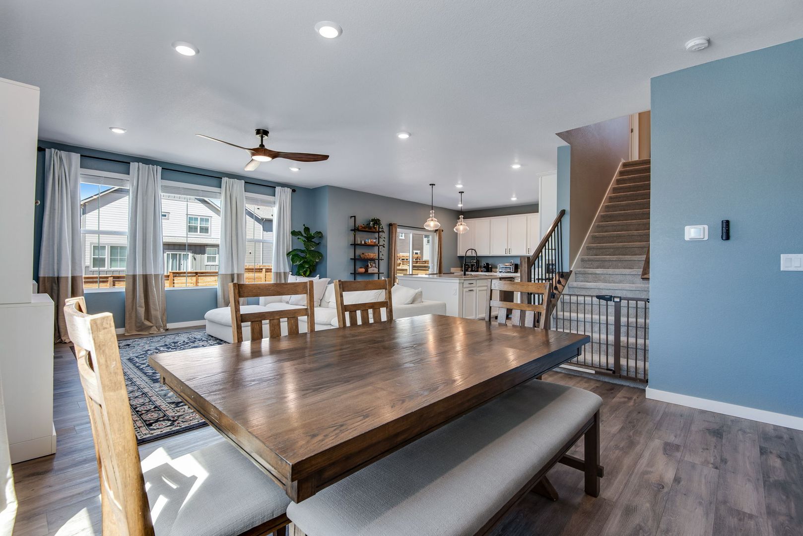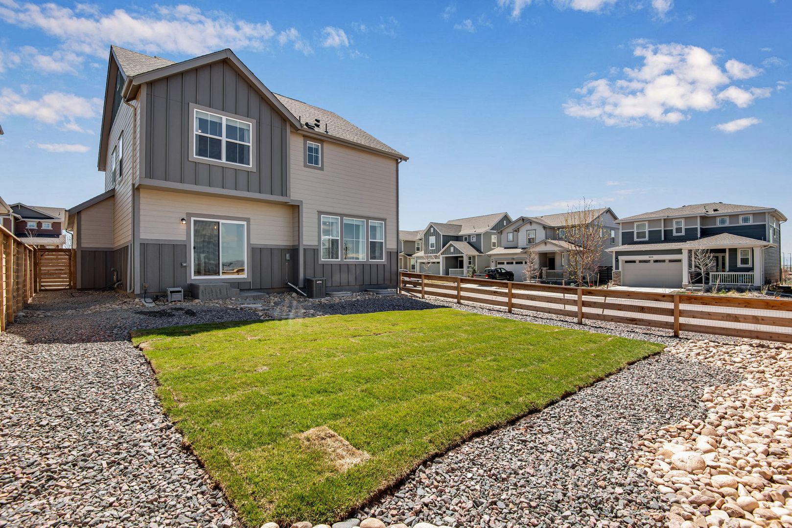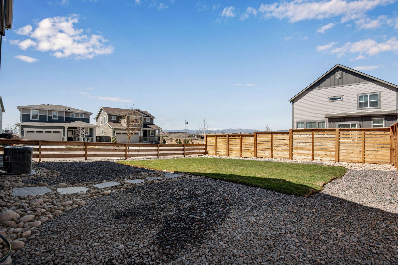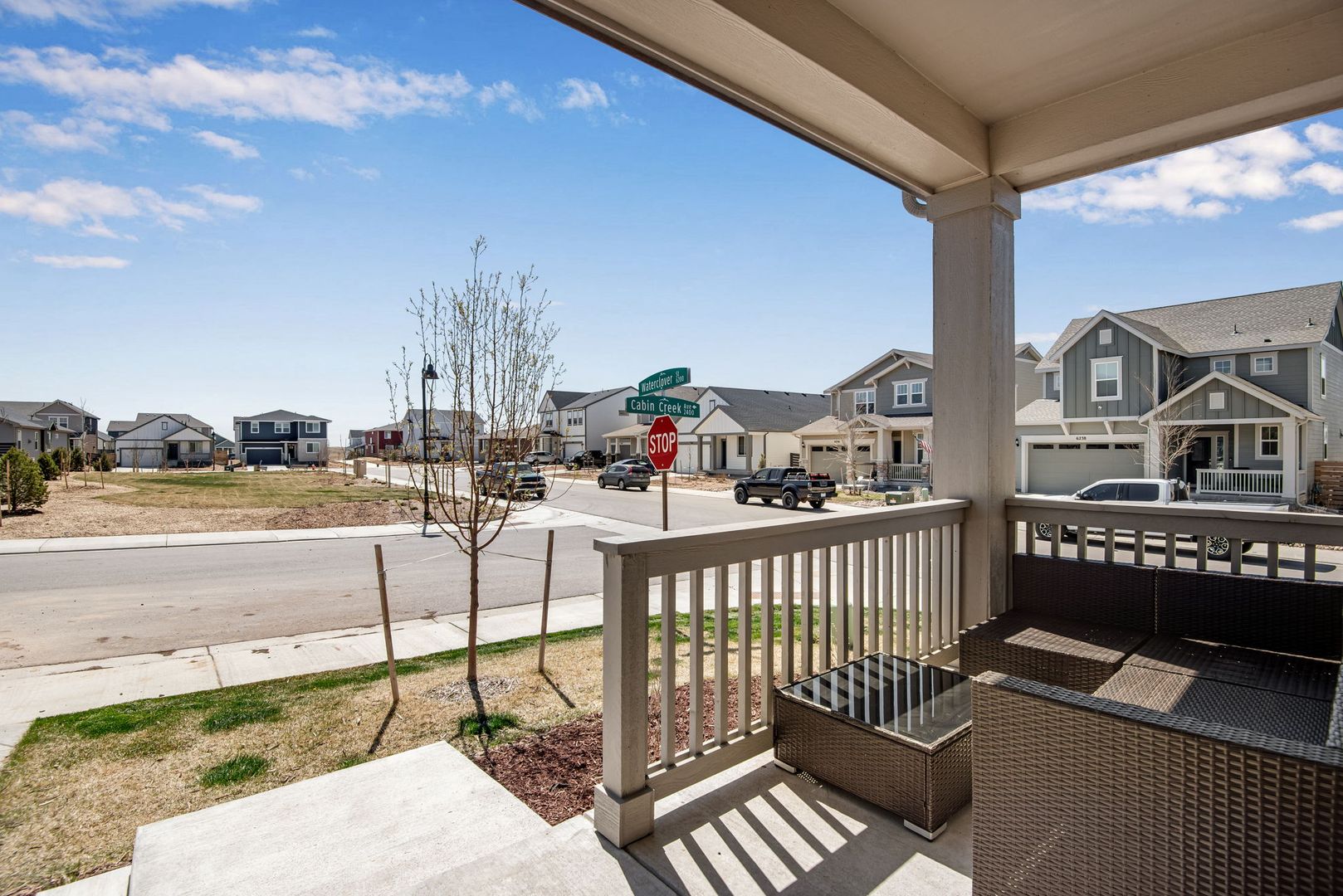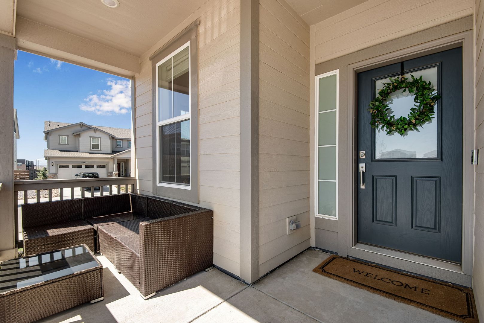 Immaculate 2-story home built in 2023. Situated on a corner lot this 4bed, 3bath gem offers 2,371SF of finished living space with an unfinished basement & oversized 2 car garage! Step inside to discover an inviting open-concept floor plan enhanced by 9-foot ceilings & abundant natural light, creating an atmosphere of spaciousness & warmth. The heart of the home is the stunning white modern kitchen, equipped w/all appliances & huge kitchen island, pantry w/custom cabinetry, & pendant lights that illuminate the space w/style. Entertain effortlessly in the adjacent dining area or unwind in the cozy living room. Escape to the second floor, where you'll find four generously sized bedrooms, including a luxurious primary suite with coffered ceiling, a remote fan & breathtaking views of Longs Peak. Pamper yourself in the attached primary bath, boasting a double vanity & shower w/seat, while a convenient laundry area adds to the ease of everyday living. Backyard is fenced & fully landscaped with views of the Front Range. The modest lawn in the front & xeriscaping around the side ensure low-maintenance living without compromising beauty. Additional highlights of this exceptional home include luxury vinyl flooring throughout main level, an active radon system, a foyer with a storage closet, and a home automation system that connects to Ring for added security & convenience. Kinston offers a vibrant community atmosphere w/pocket parks, future plans for pool & school located nearby. The Kinston Hub is a stone's throw away & features coffee, drinks & food.