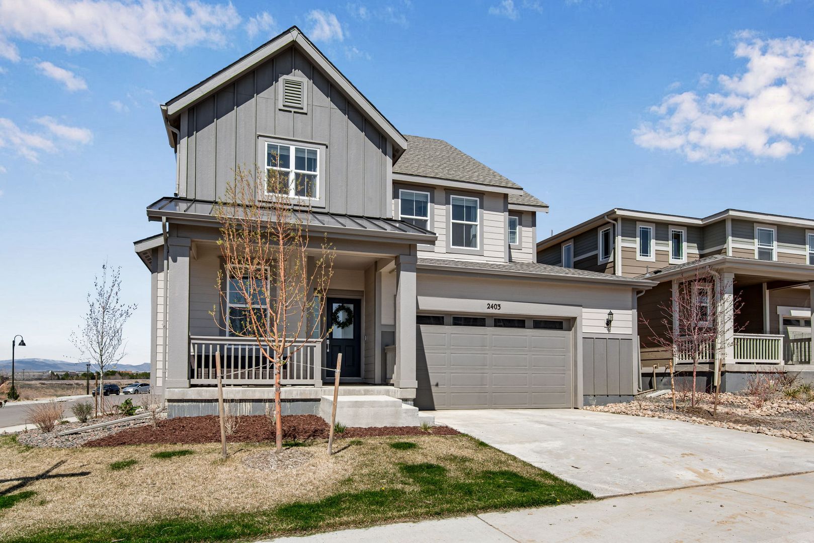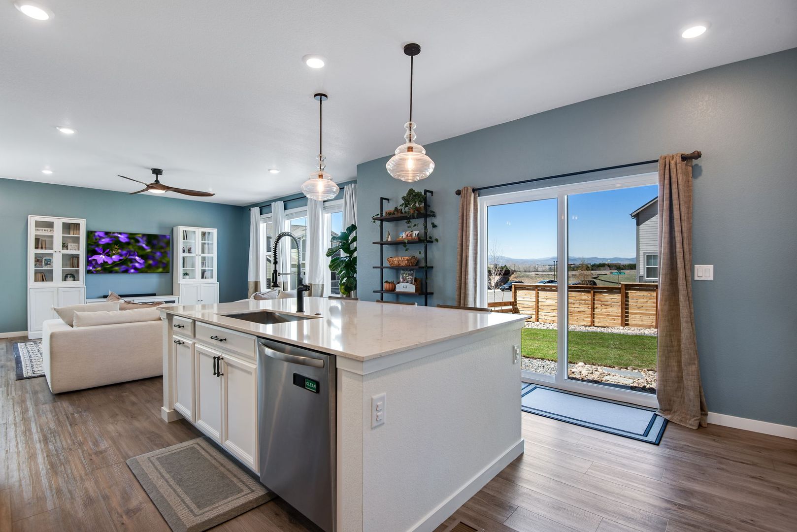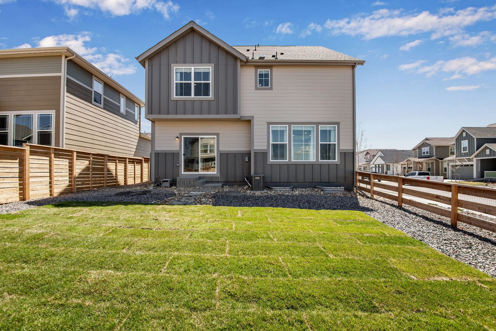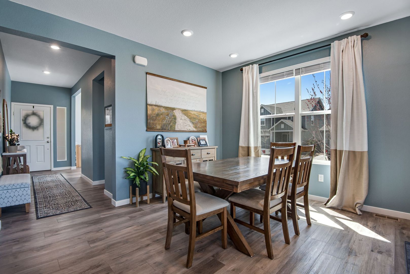 Immaculate 2-story home built in 2023. Situated on a corner lot this 4bed, 3bath gem offers 2,371SF of finished living space with an unfinished basement & oversized 2 car garage! Step inside to discover an inviting open-concept floor plan enhanced by 9-foot ceilings & abundant natural light, creating an atmosphere of spaciousness & warmth. The heart of the home is the stunning white modern kitchen, equipped w/all appliances & huge kitchen island, pantry w/custom cabinetry, & pendant lights that illuminate the space w/style. Entertain effortlessly in the adjacent dining area or unwind in the cozy living room. Escape to the second floor, where you'll find four generously sized bedrooms, including a luxurious primary suite with coffered ceiling, a remote fan & breathtaking views of Longs Peak. Pamper yourself in the attached primary bath, boasting a double vanity & shower w/seat, while a convenient laundry area adds to the ease of everyday living. Backyard is fenced & fully landscaped with views of the Front Range. The modest lawn in the front & xeriscaping around the side ensure low-maintenance living without compromising beauty. Additional highlights of this exceptional home include luxury vinyl flooring throughout main level, an active radon system, a foyer with a storage closet, and a home automation system that connects to Ring for added security & convenience. Kinston offers a vibrant community atmosphere w/pocket parks, future plans for pool & school located nearby. The Kinston Hub is a stone's throw away & features coffee, drinks & food.