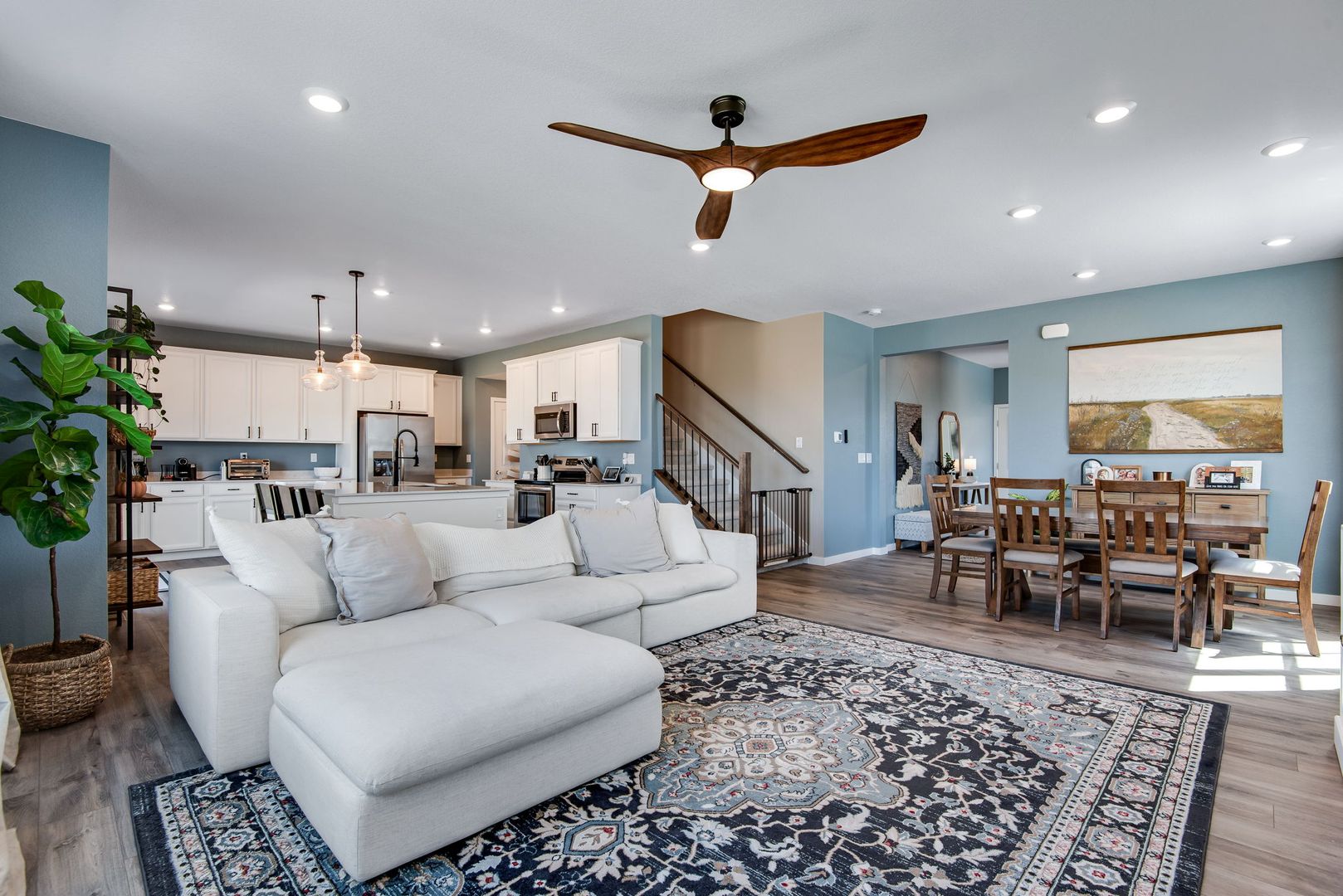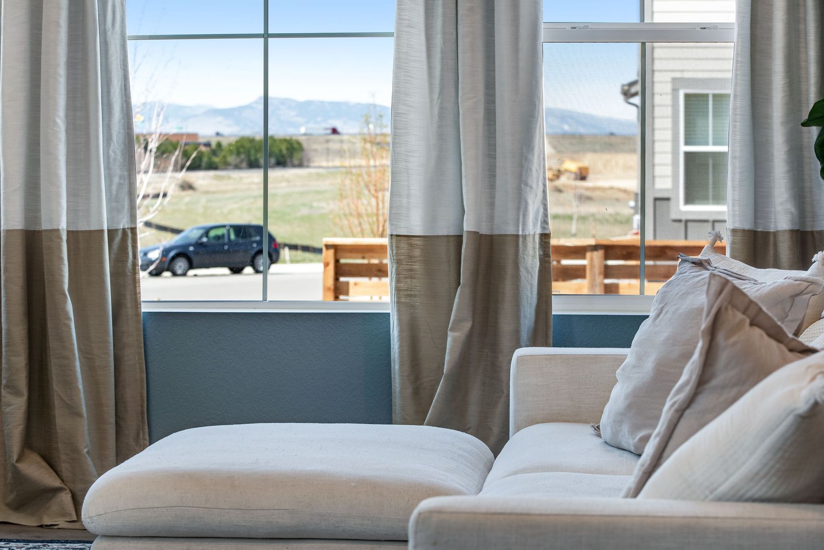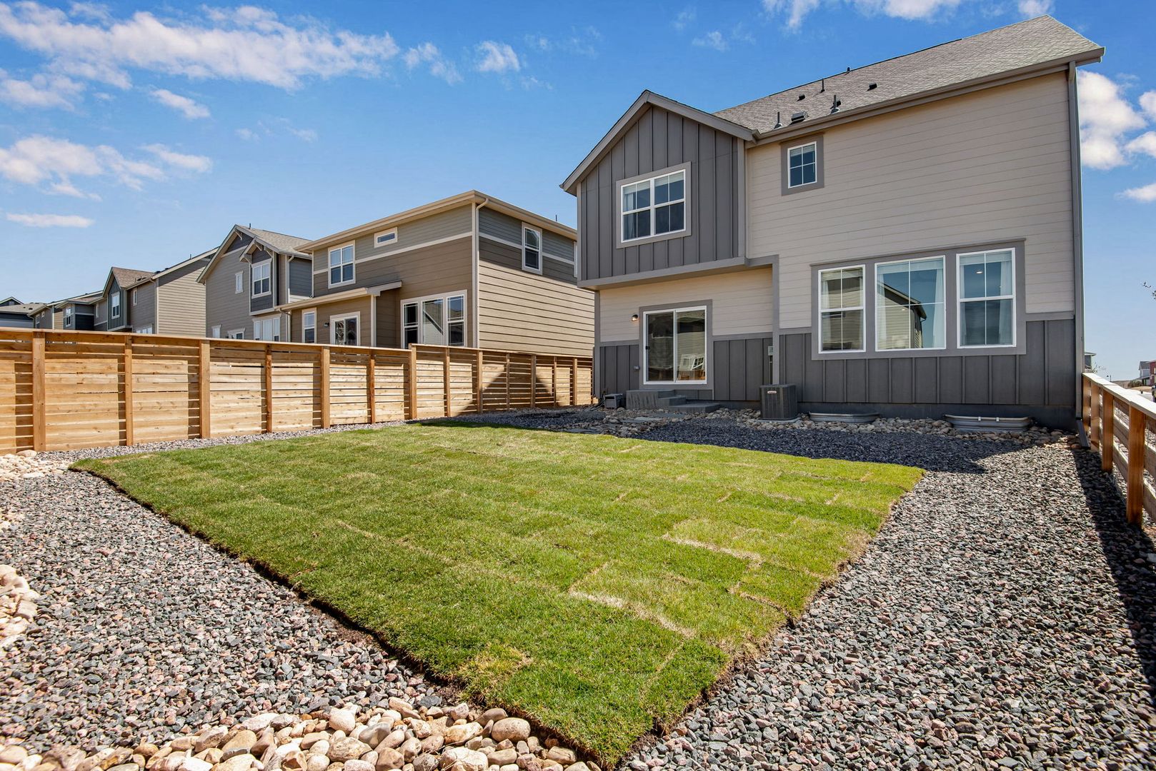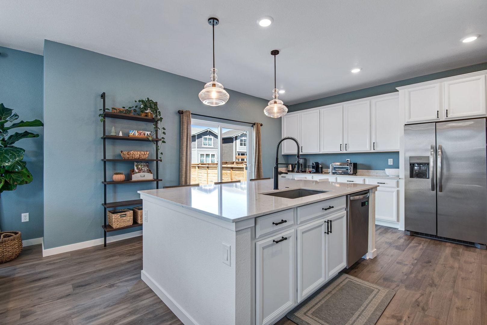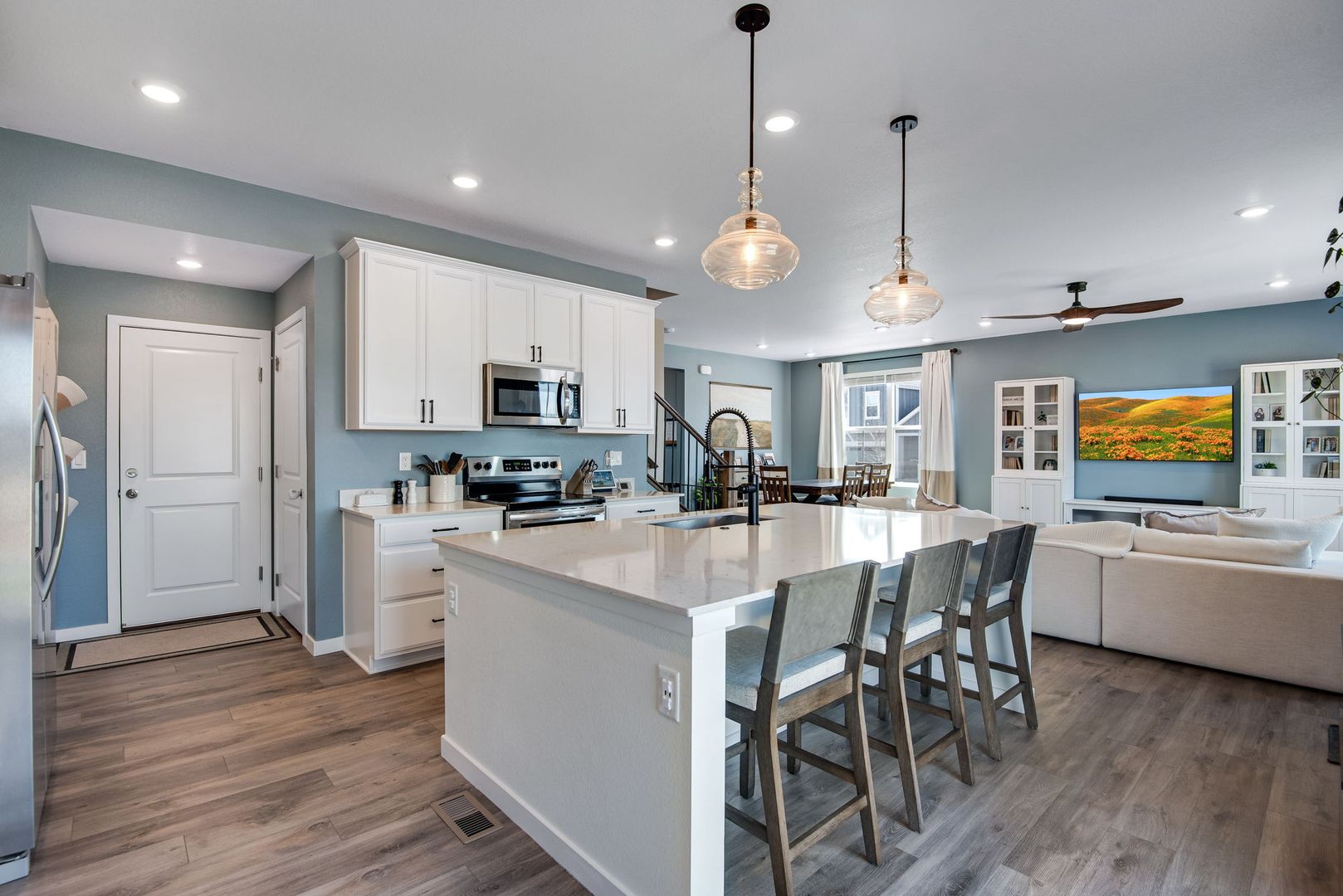 Immaculate 2-story home built in 2023. Situated on a corner lot this 4bed, 3bath gem offers 2,371SF of finished living space with an unfinished basement & oversized 2 car garage! Step inside to discover an inviting open-concept floor plan enhanced by 9-foot ceilings & abundant natural light, creating an atmosphere of spaciousness & warmth. The heart of the home is the stunning white modern kitchen, equipped w/all appliances & huge kitchen island, pantry w/custom cabinetry, & pendant lights that illuminate the space w/style. Entertain effortlessly in the adjacent dining area or unwind in the cozy living room. Escape to the second floor, where you'll find four generously sized bedrooms, including a luxurious primary suite with coffered ceiling, a remote fan & breathtaking views of Longs Peak. Pamper yourself in the attached primary bath, boasting a double vanity & shower w/seat, while a convenient laundry area adds to the ease of everyday living. Backyard is fenced & fully landscaped with views of the Front Range. The modest lawn in the front & xeriscaping around the side ensure low-maintenance living without compromising beauty. Additional highlights of this exceptional home include luxury vinyl flooring throughout main level, an active radon system, a foyer with a storage closet, and a home automation system that connects to Ring for added security & convenience. Kinston offers a vibrant community atmosphere w/pocket parks, future plans for pool & school located nearby. The Kinston Hub is a stone's throw away & features coffee, drinks & food.