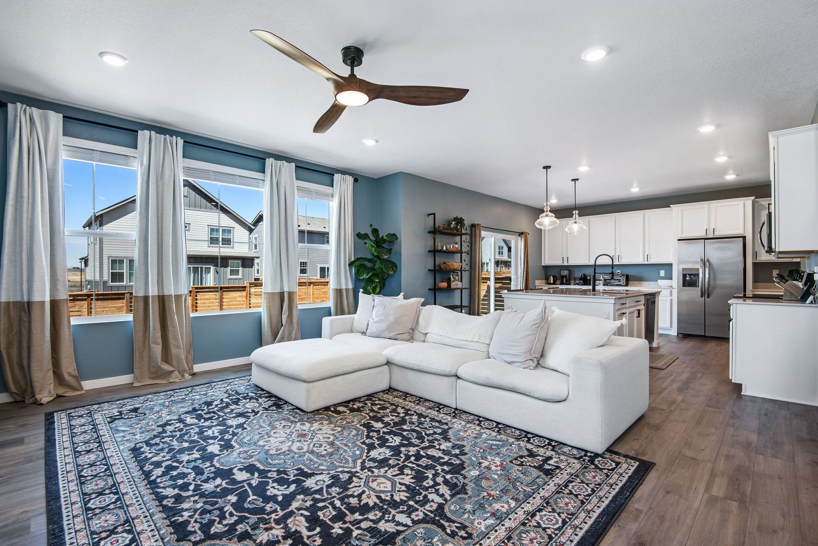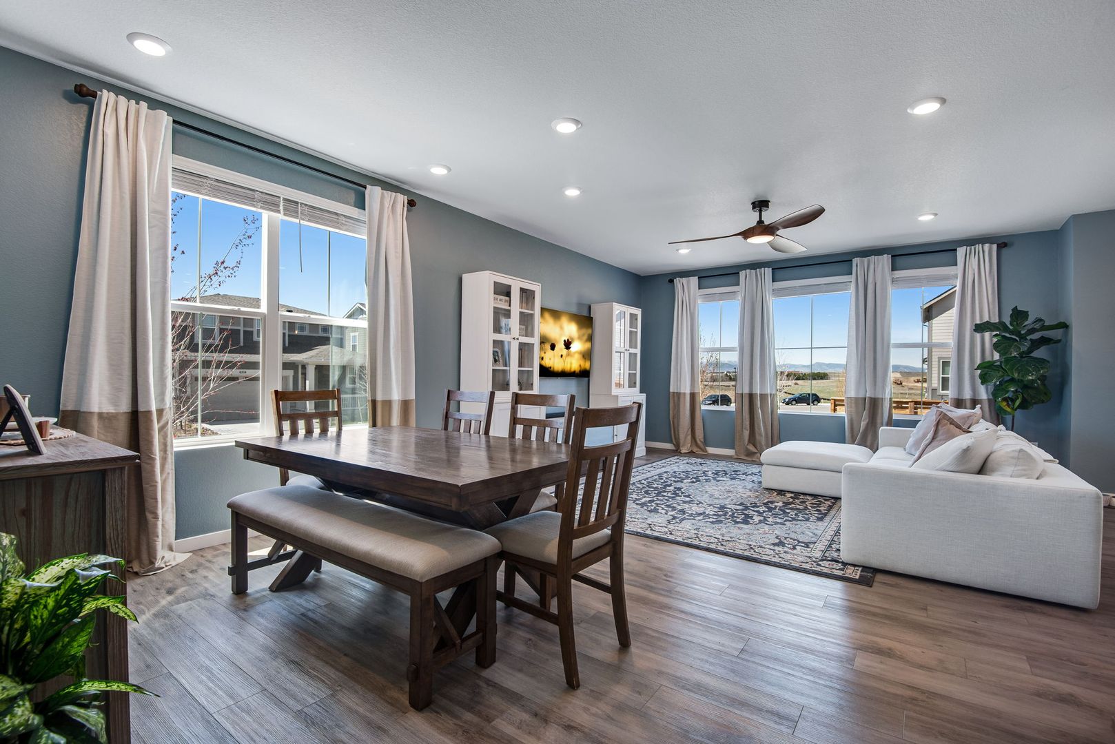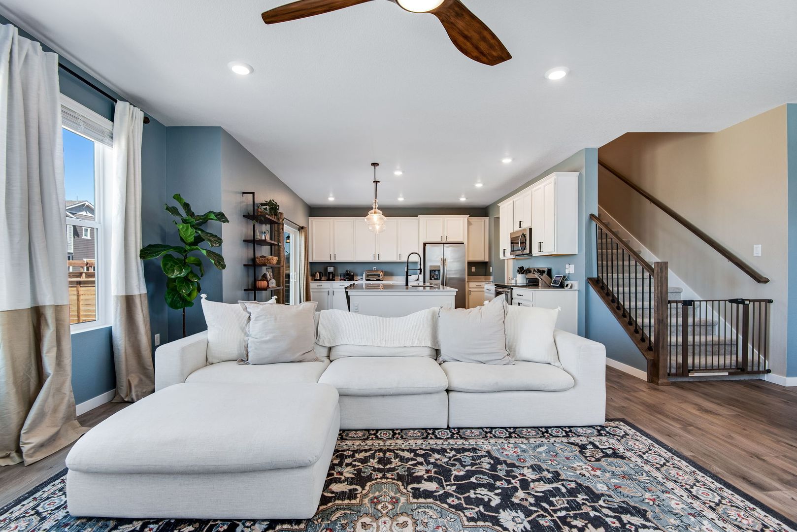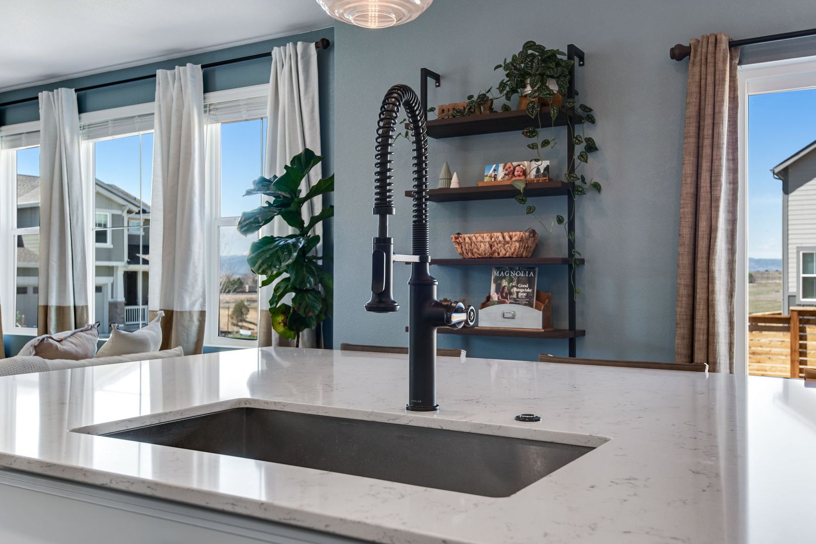 Immaculate 2-story home built in 2023. Situated on a corner lot this 4bed, 3bath gem offers 2,371SF of finished living space with an unfinished basement & oversized 2 car garage! Step inside to discover an inviting open-concept floor plan enhanced by 9-foot ceilings & abundant natural light, creating an atmosphere of spaciousness & warmth. The heart of the home is the stunning white modern kitchen, equipped w/all appliances & huge kitchen island, pantry w/custom cabinetry, & pendant lights that illuminate the space w/style. Entertain effortlessly in the adjacent dining area or unwind in the cozy living room. Escape to the second floor, where you'll find four generously sized bedrooms, including a luxurious primary suite with coffered ceiling, a remote fan & breathtaking views of Longs Peak. Pamper yourself in the attached primary bath, boasting a double vanity & shower w/seat, while a convenient laundry area adds to the ease of everyday living. Backyard is fenced & fully landscaped with views of the Front Range. The modest lawn in the front & xeriscaping around the side ensure low-maintenance living without compromising beauty. Additional highlights of this exceptional home include luxury vinyl flooring throughout main level, an active radon system, a foyer with a storage closet, and a home automation system that connects to Ring for added security & convenience. Kinston offers a vibrant community atmosphere w/pocket parks, future plans for pool & school located nearby. The Kinston Hub is a stone's throw away & features coffee, drinks & food.