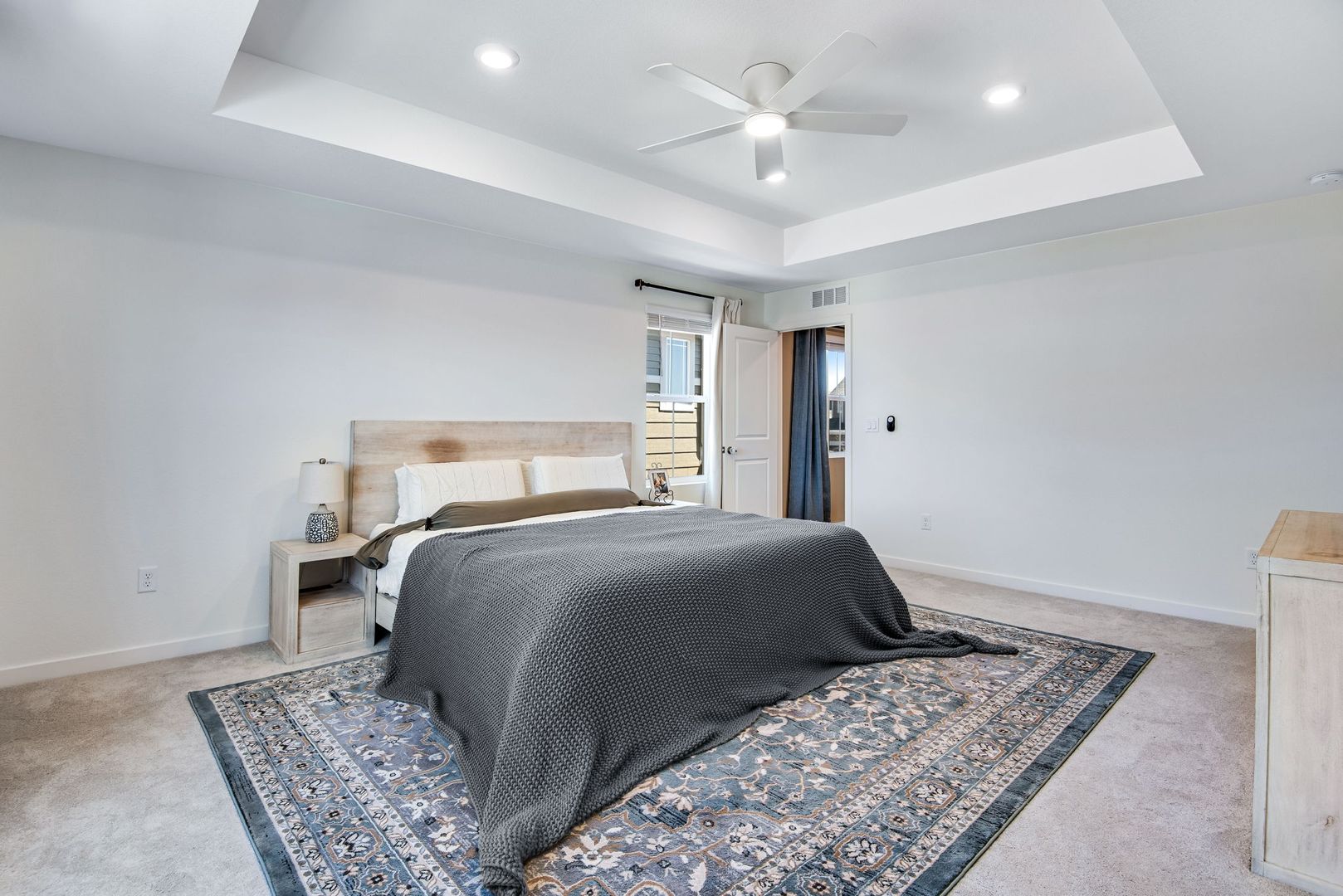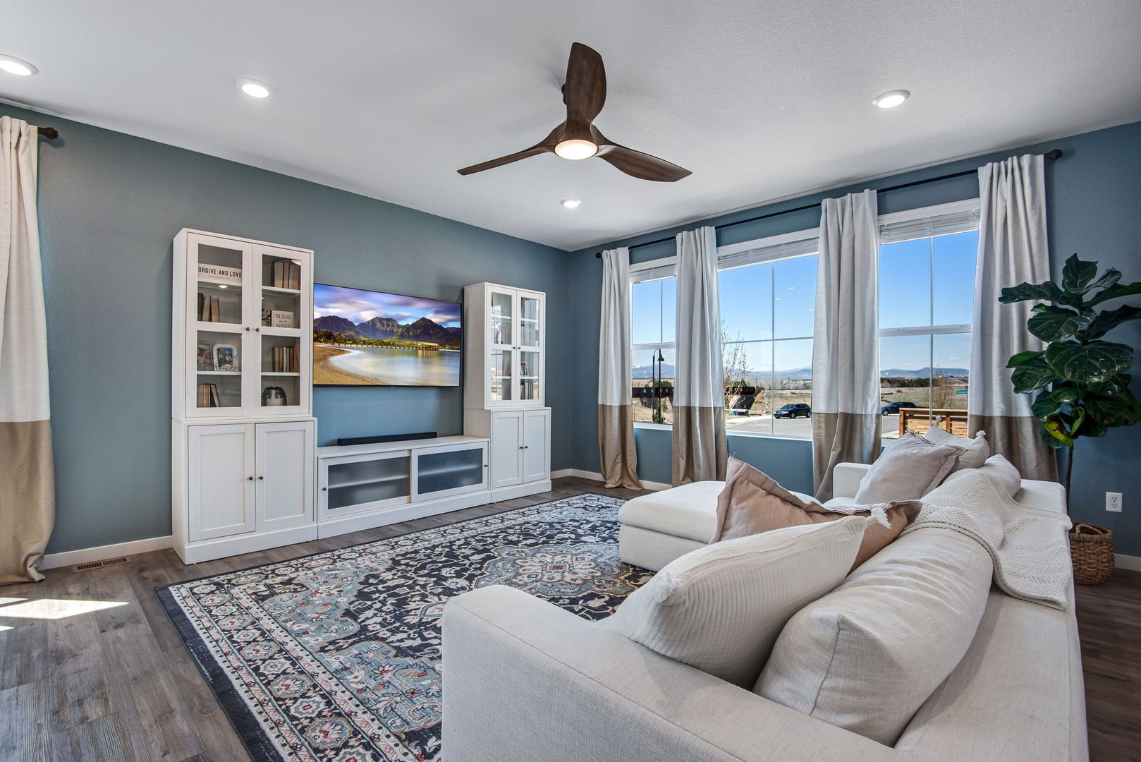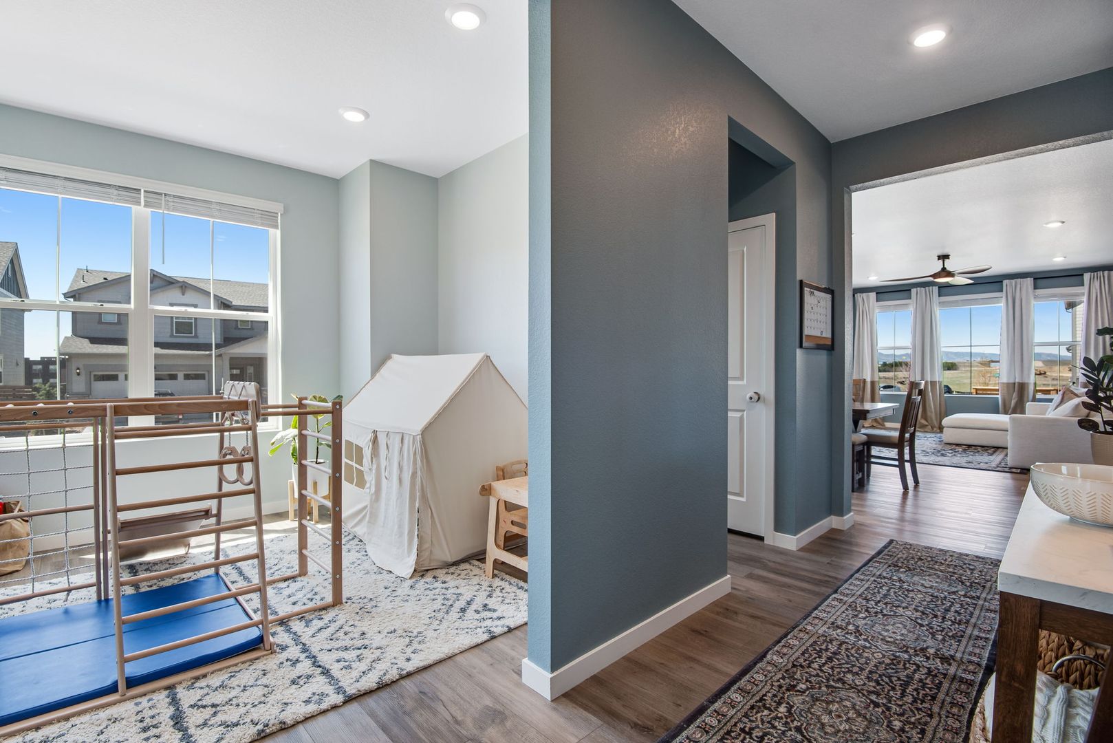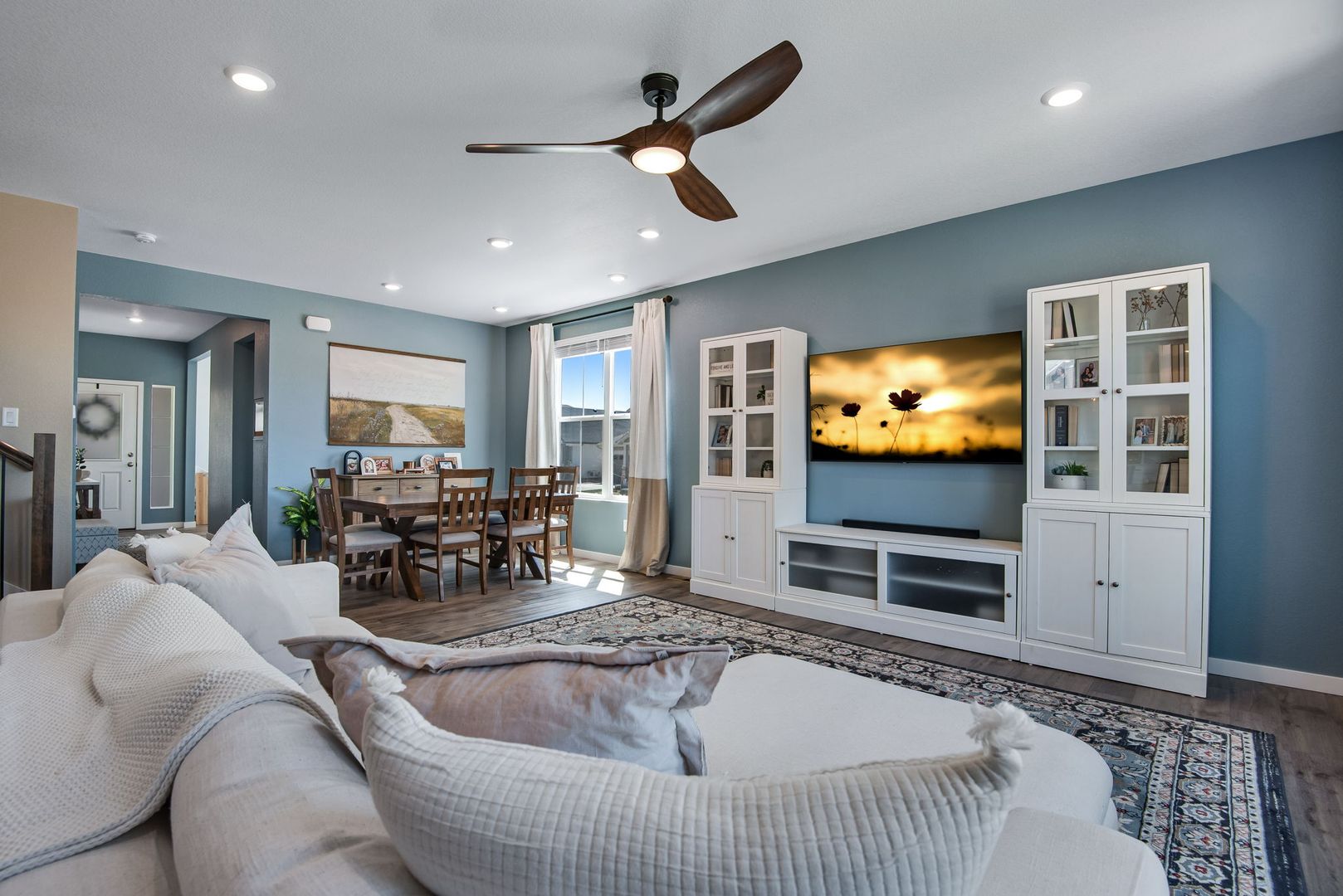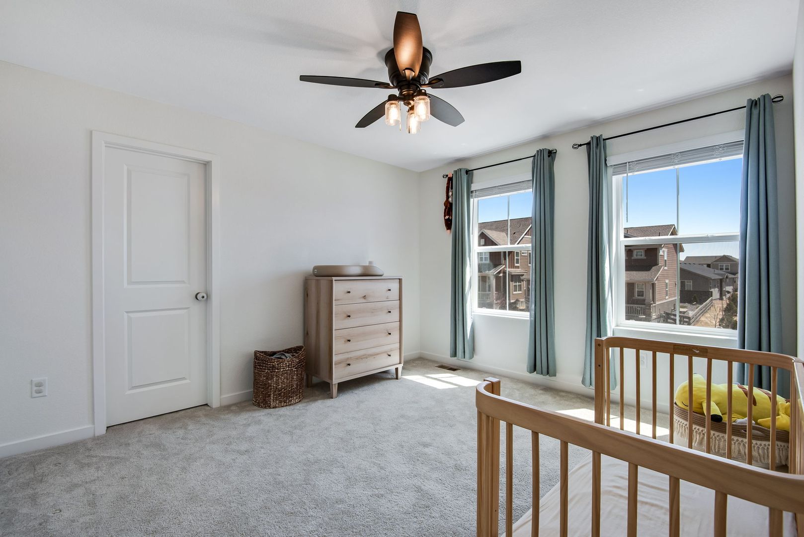 Immaculate 2-story home built in 2023. Situated on a corner lot this 4bed, 3bath gem offers 2,371SF of finished living space with an unfinished basement & oversized 2 car garage! Step inside to discover an inviting open-concept floor plan enhanced by 9-foot ceilings & abundant natural light, creating an atmosphere of spaciousness & warmth. The heart of the home is the stunning white modern kitchen, equipped w/all appliances & huge kitchen island, pantry w/custom cabinetry, & pendant lights that illuminate the space w/style. Entertain effortlessly in the adjacent dining area or unwind in the cozy living room. Escape to the second floor, where you'll find four generously sized bedrooms, including a luxurious primary suite with coffered ceiling, a remote fan & breathtaking views of Longs Peak. Pamper yourself in the attached primary bath, boasting a double vanity & shower w/seat, while a convenient laundry area adds to the ease of everyday living. Backyard is fenced & fully landscaped with views of the Front Range. The modest lawn in the front & xeriscaping around the side ensure low-maintenance living without compromising beauty. Additional highlights of this exceptional home include luxury vinyl flooring throughout main level, an active radon system, a foyer with a storage closet, and a home automation system that connects to Ring for added security & convenience. Kinston offers a vibrant community atmosphere w/pocket parks, future plans for pool & school located nearby. The Kinston Hub is a stone's throw away & features coffee, drinks & food.