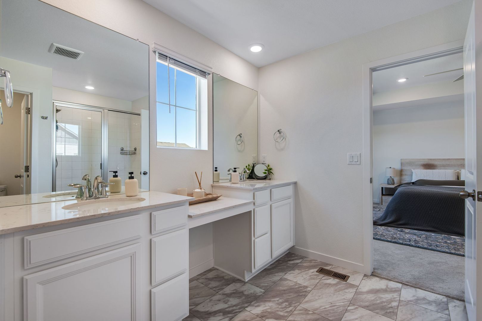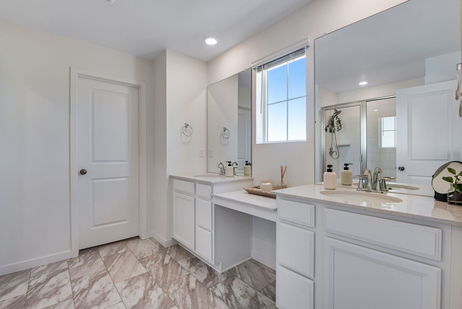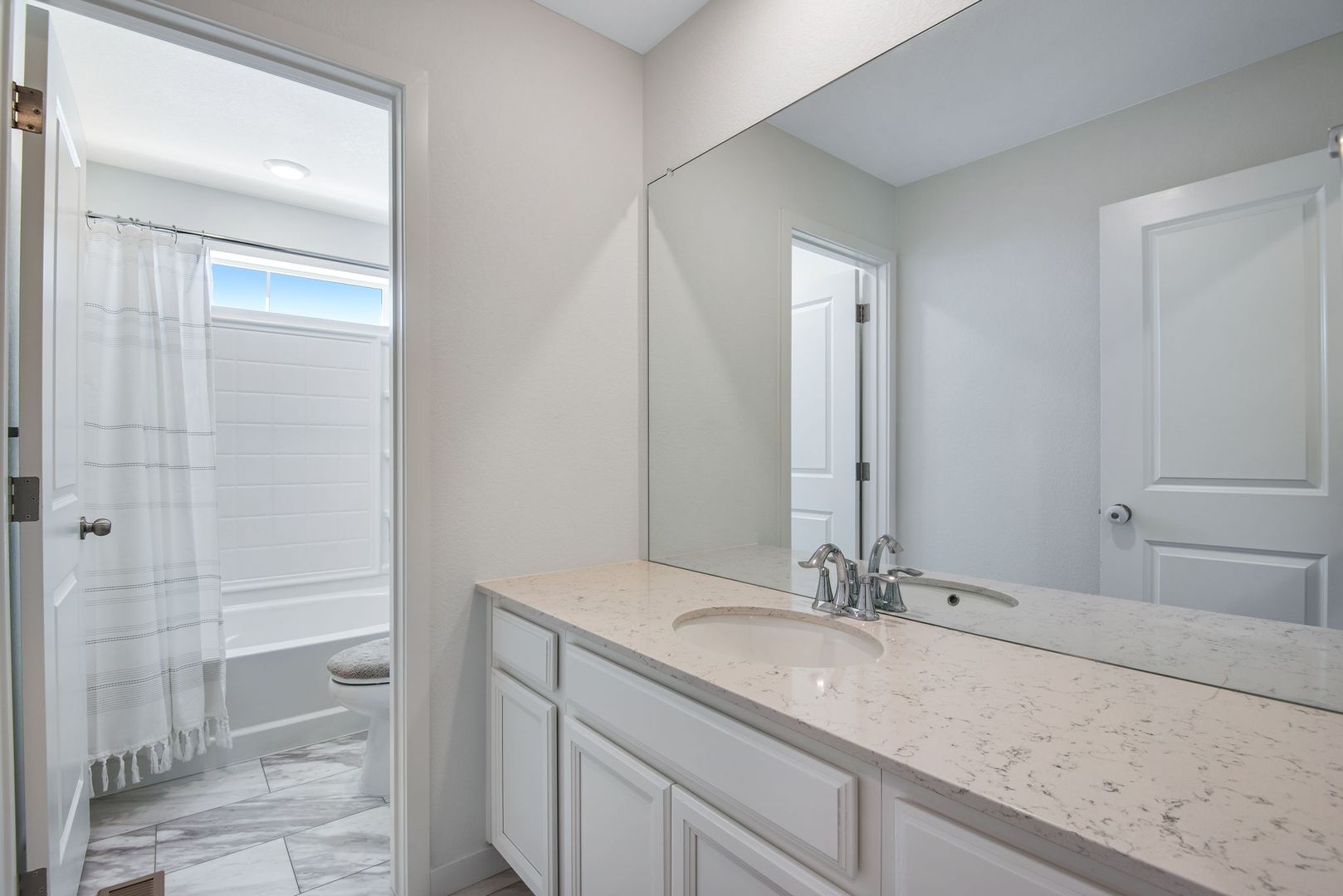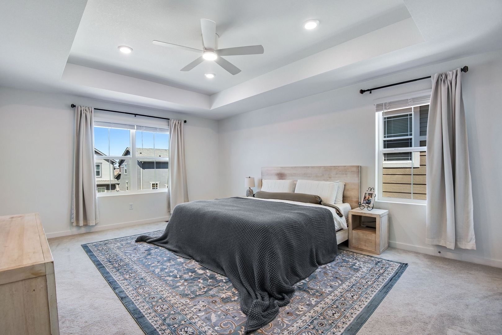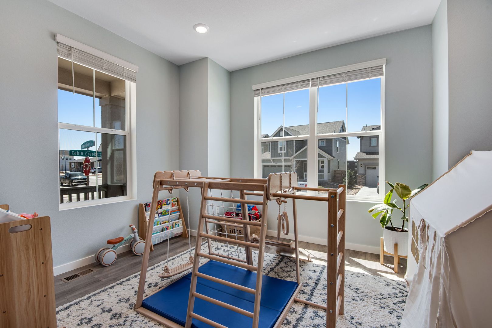 Immaculate 2-story home built in 2023. Situated on a corner lot this 4bed, 3bath gem offers 2,371SF of finished living space with an unfinished basement & oversized 2 car garage! Step inside to discover an inviting open-concept floor plan enhanced by 9-foot ceilings & abundant natural light, creating an atmosphere of spaciousness & warmth. The heart of the home is the stunning white modern kitchen, equipped w/all appliances & huge kitchen island, pantry w/custom cabinetry, & pendant lights that illuminate the space w/style. Entertain effortlessly in the adjacent dining area or unwind in the cozy living room. Escape to the second floor, where you'll find four generously sized bedrooms, including a luxurious primary suite with coffered ceiling, a remote fan & breathtaking views of Longs Peak. Pamper yourself in the attached primary bath, boasting a double vanity & shower w/seat, while a convenient laundry area adds to the ease of everyday living. Backyard is fenced & fully landscaped with views of the Front Range. The modest lawn in the front & xeriscaping around the side ensure low-maintenance living without compromising beauty. Additional highlights of this exceptional home include luxury vinyl flooring throughout main level, an active radon system, a foyer with a storage closet, and a home automation system that connects to Ring for added security & convenience. Kinston offers a vibrant community atmosphere w/pocket parks, future plans for pool & school located nearby. The Kinston Hub is a stone's throw away & features coffee, drinks & food.