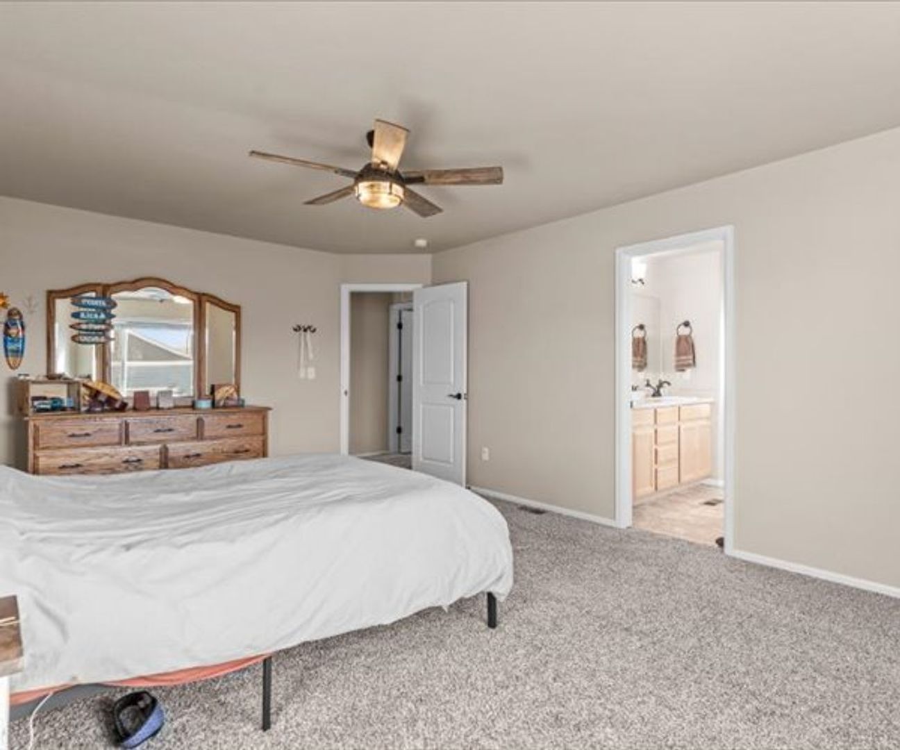 Discover this spacious 4-bedroom, 3-bath offering vaulted ceilings and engineered hardwood floors that create an inviting main living area. The main floor office is conveniently located near the front door, and the open kitchen has great light, a spacious island, and a corner pantry. Upstairs the private primary suite includes a 5-piece bathroom and walk-in closet. Two additional bedrooms upstairs share a full bathroom, and the 4th bedroom is on the ground floor near the living room and another full bathroom. Central heat and A/C, ceiling fans, a high-efficiency furnace, and double-pane windows provide for year-round comfort. Outside, enjoy a fully fenced yard with sprinklers for easy watering, and an oversized attached 2-car garage for extra storage and parking.